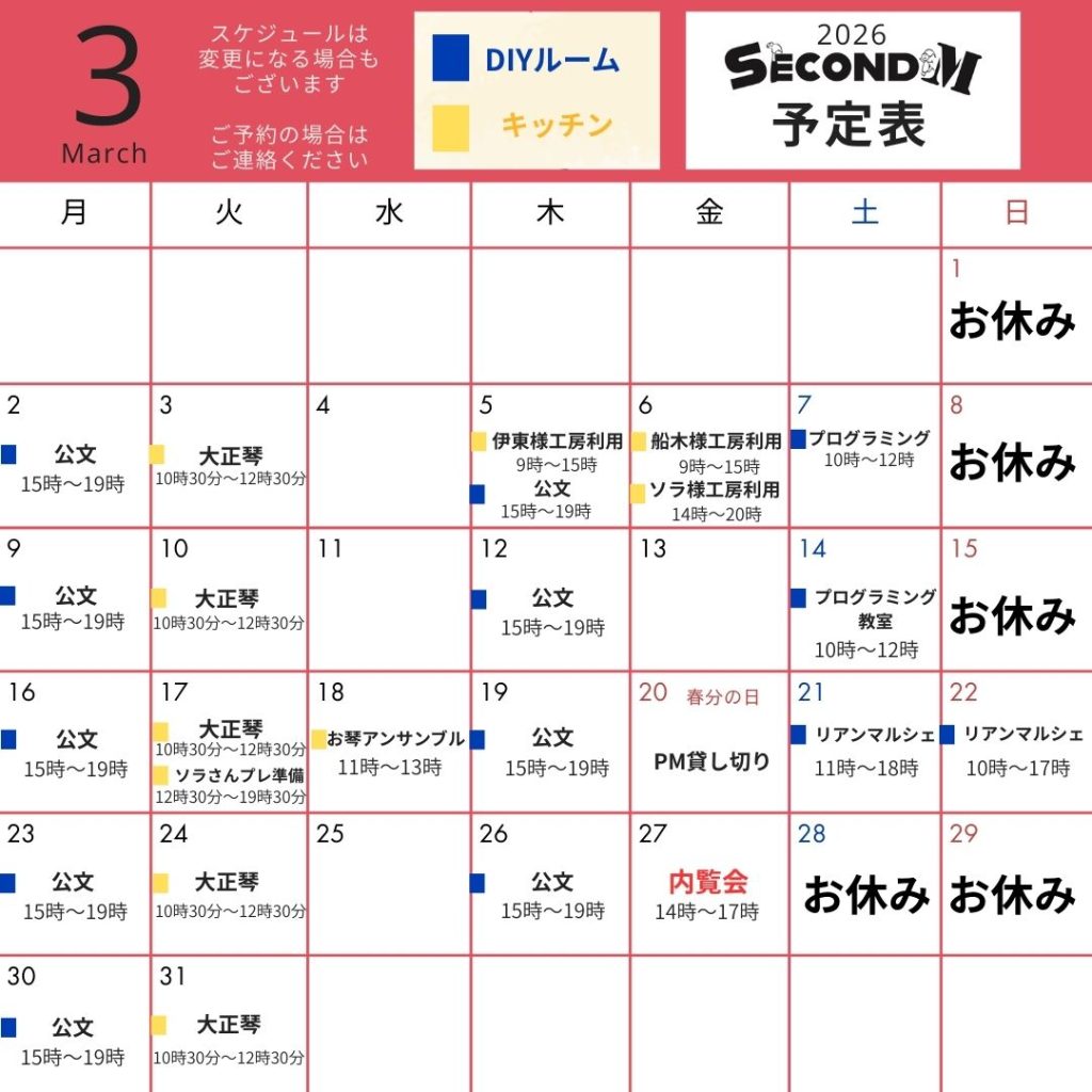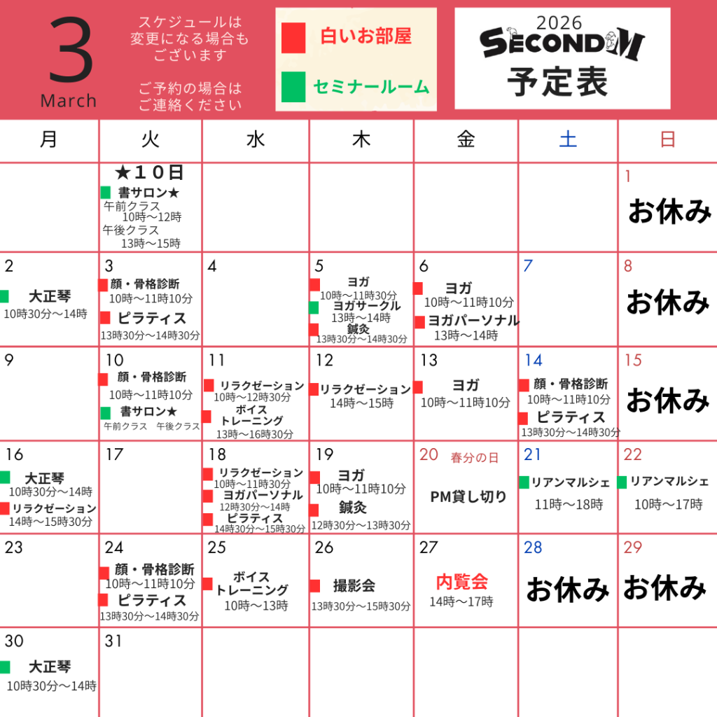 3月カレンダー 2026.02.28 by 管理人 ちかこ 0 お待たせしました!令和8年3月のスペースカレンダーです。ご興味のあるイベントは公式ラインからお問合せくださいね! secondM公式ラインはこちらから↓↓ https://lin.ee/fxJyt8P